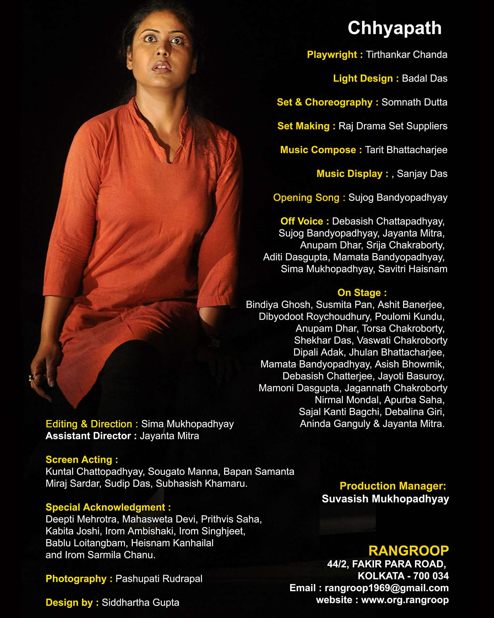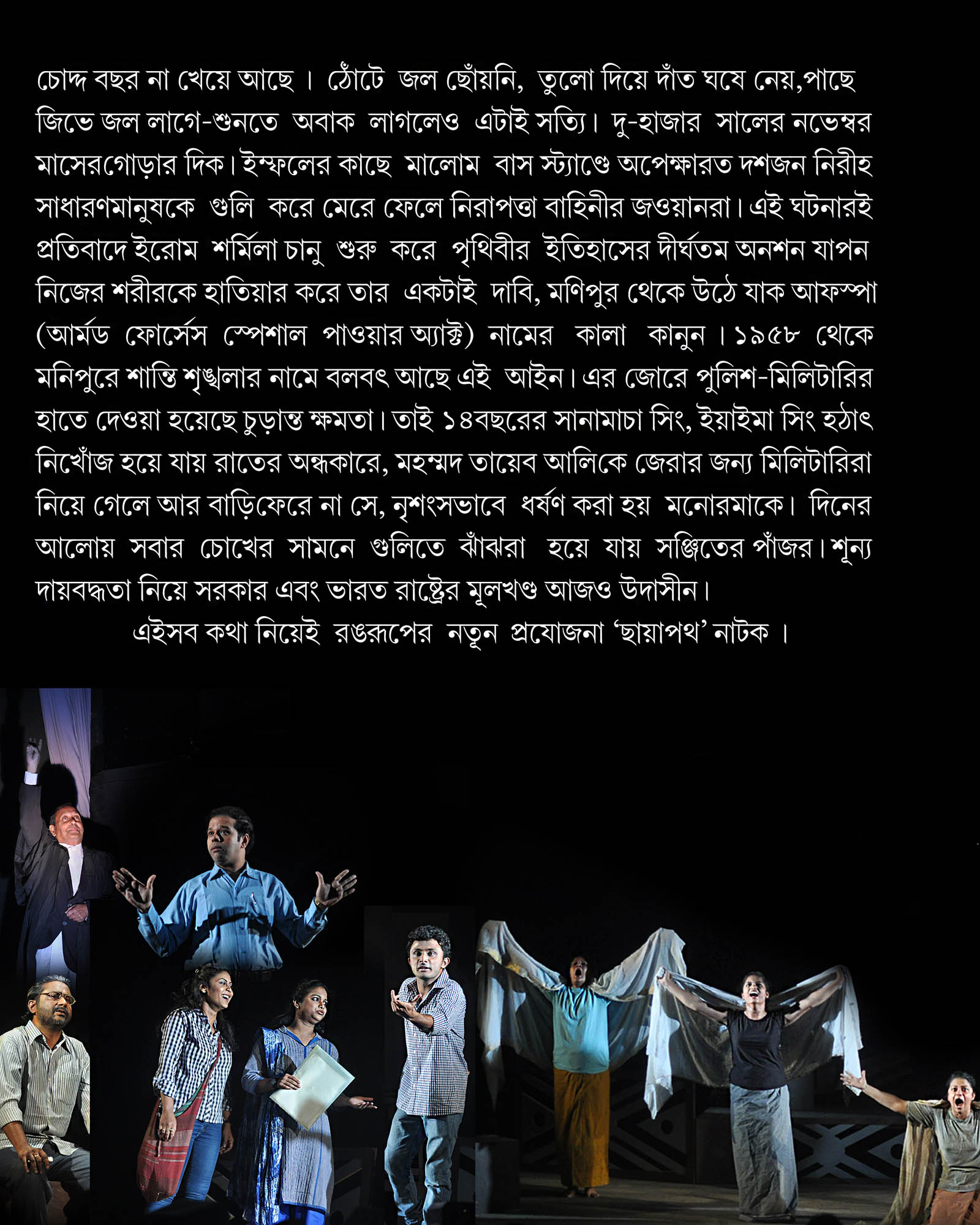 He has not eaten for fourteen years. He does not touch his lips, rubs his teeth with a cotton swab, in case his tongue gets wet- this is surprising, but it is true. It is early November of the year 2000. Ten innocent civilians are shot dead while waiting at the Malom bus stand near Imphal. Killed by the security forces. In protest of this incident, Irom Sharmila Chanu started the longest hunger strike in the history of the world by using her own body as a tool. Her only demand is to remove the black law called AFSPA (Armed Forces Special Power Act) from Manipur. This law has been in force in Manipur since 1958 in the name of peace and order. This force has given ultimate power to the police-military. So, 14-year-old Sanamacha Singh, Yaima Singh suddenly disappeared in the dark, Mohammad Taib Ali was taken by the military for questioning and never returned home. Monorama was brutally raped. Sanjeev's chest ribs were riddled with bullets in broad daylight. The government and the core of the Indian state are still apathetic with zero accountability. Rangroop's new production "Chhayapath" drama is about these words.