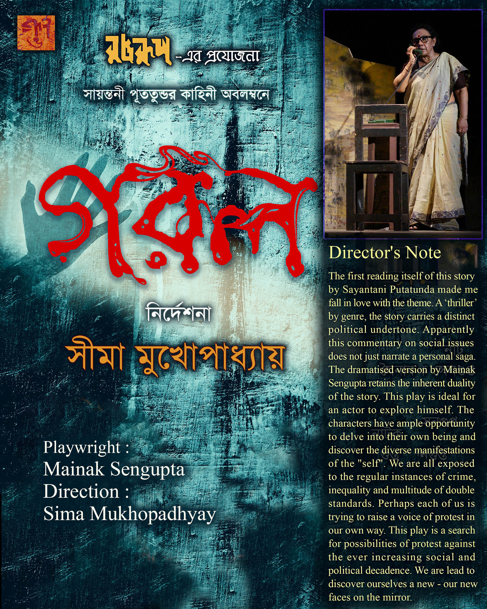 The first reading itself of this story Sayantani Putatunda made me fall in love with theme. A "thriller "by genre, the story carries a distinct political undertone. Apparently, this commentary on social issues doesn’t just narrate a personal saga. The dramatised version by Mainak Sengupta retains the inherent duality of the story. This play is ideal for an actor to explore himself. The characters have ample opportunity to delve into their own being and discover the diverse manifestations of the "self”. We are all exposed to the regular instances of crime, inequality and multitude of double standards. Perhaps each of us is trying to raise a voice of protest in our own way. This play is a search for possibilities of protest against the ever increasing social and political decadence, we are lead to discover ourselves a new - our new faces on the mirror.