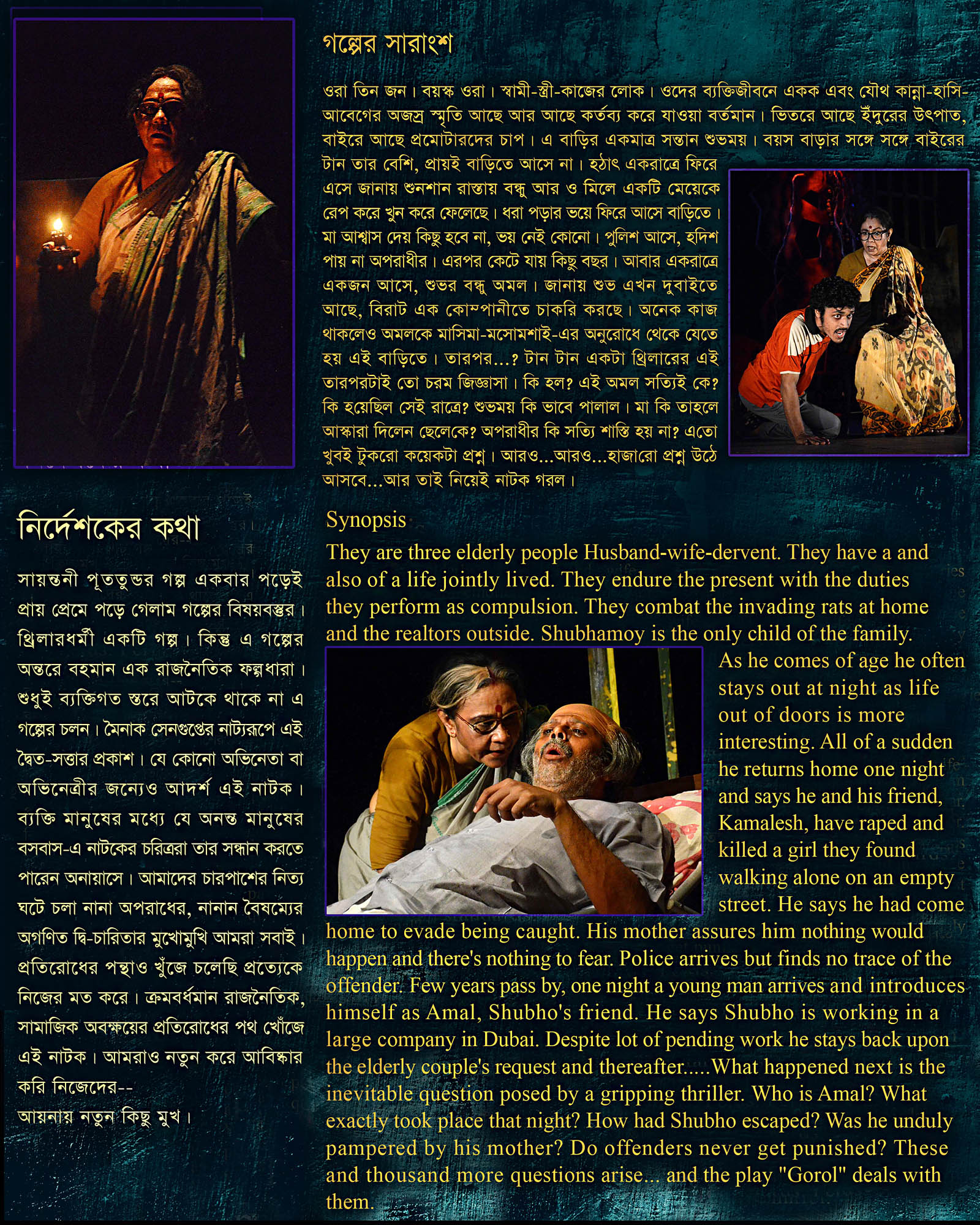 What happened next is the inevitable question posed by a gripping thriller. Who is Amal? What exactly took place that night? How had Shubho escaped? Was he unduly pampered by his mother? Do offenders never get punished? These and thousand more questions arise……and the play “Gorol” deals with them.