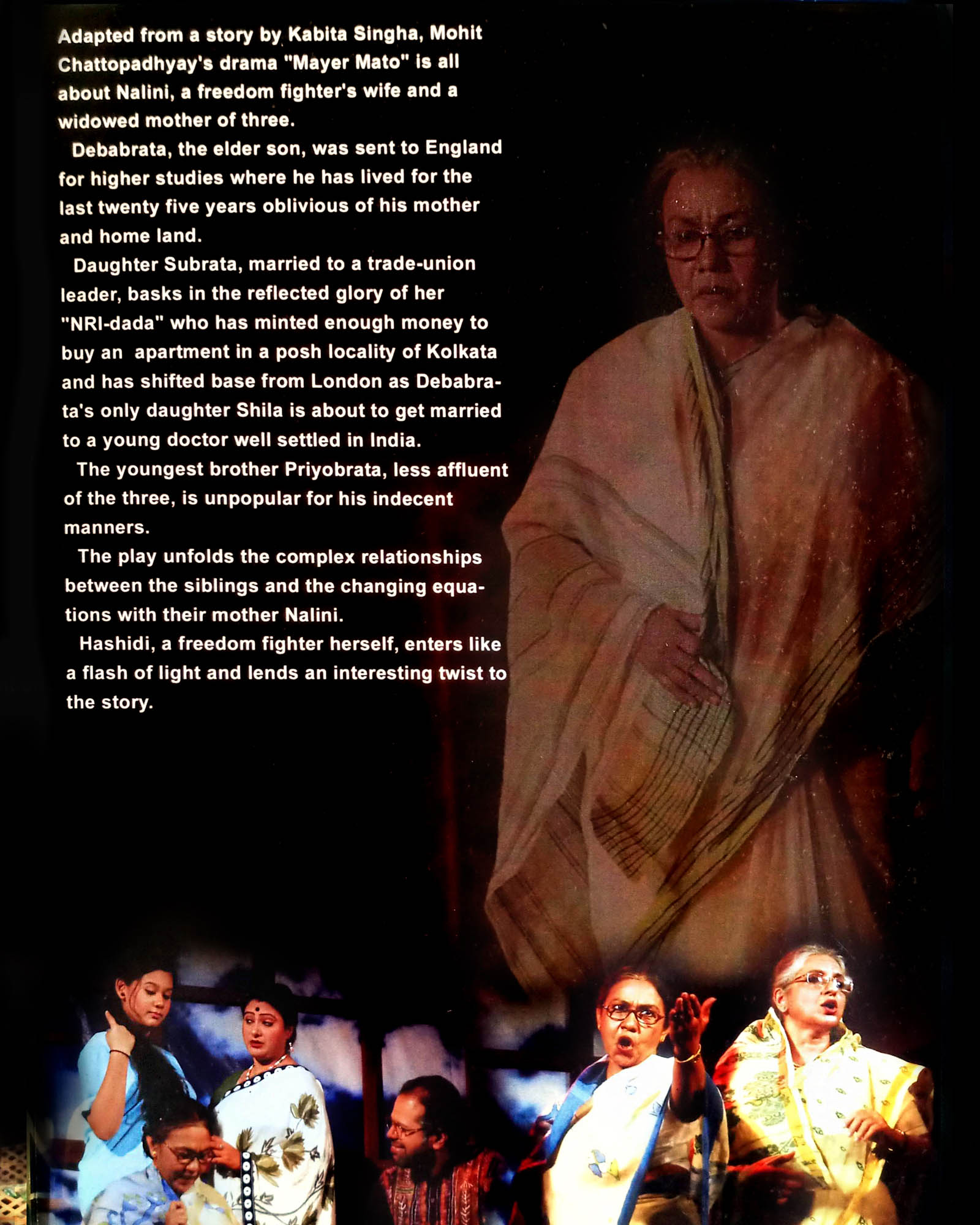 Adapted from a story by Kabita Sinha, Mohit Chattopadhyay’s drama “Mayer Moto” is all about Nalini, a freedom fighter’s wife and a widowed mother of three. Debabrata, the elder son, was sent to England for higher studies where he has lived for the last twenty five years oblivious of his mother and home land.