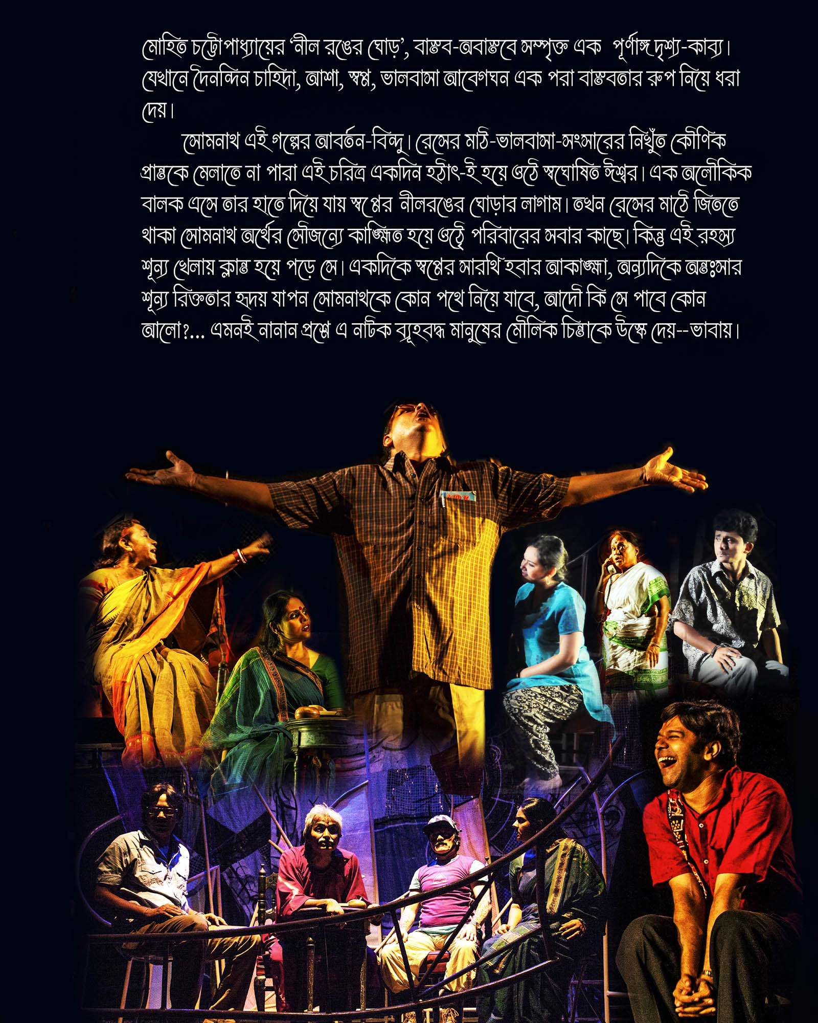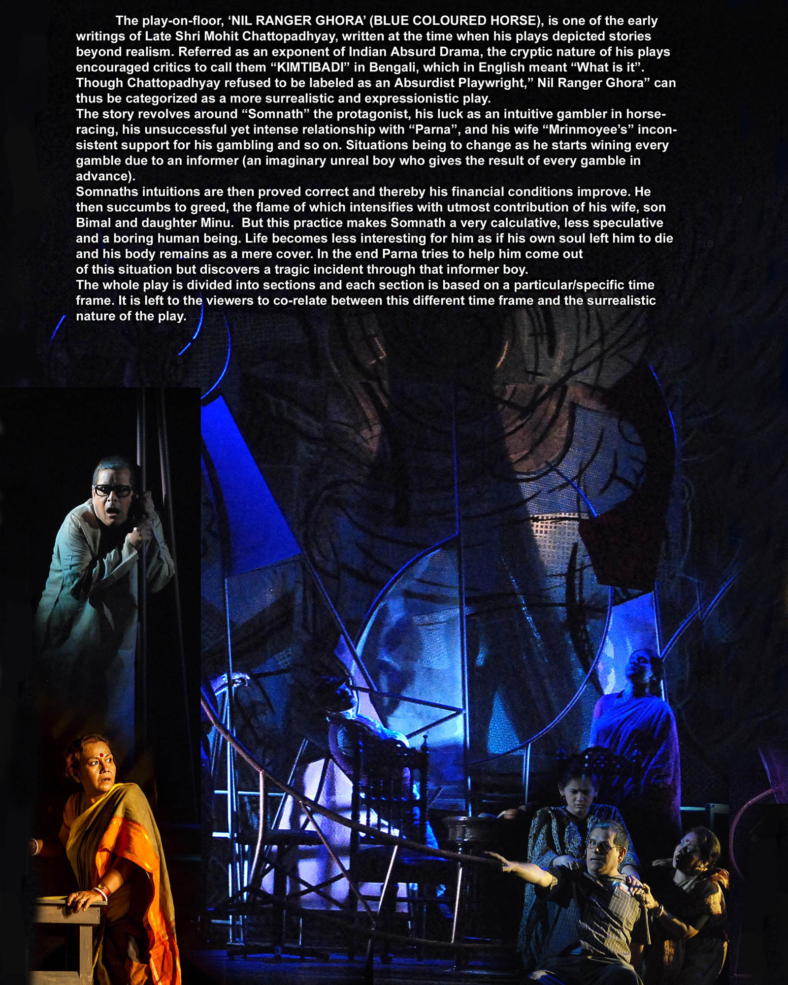 The play on floor, 'Nil Ranger Ghora' (BLUE COLOURED HORSE), is one of the early writings of Late Shri Mohit Chattopadhyay, written at the time when his plays depicted stories beyond realism. Referred as an exponent of Indian Absurd Drama, the cryptic nature of his plays encouraged critics to call them " KIMTIBADI" in Bengali, which is English meant "What is it ".