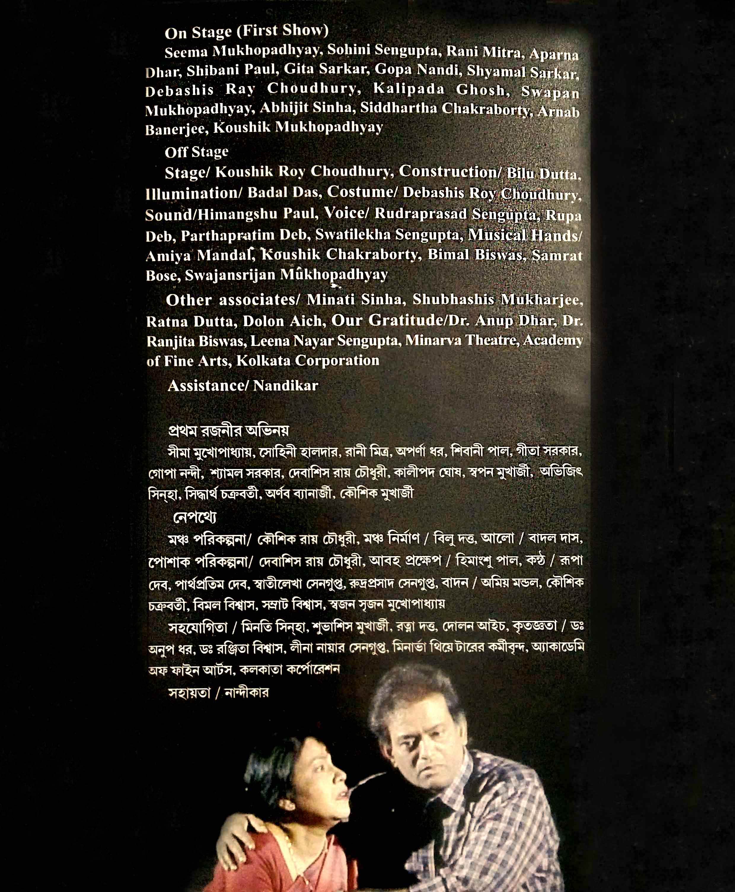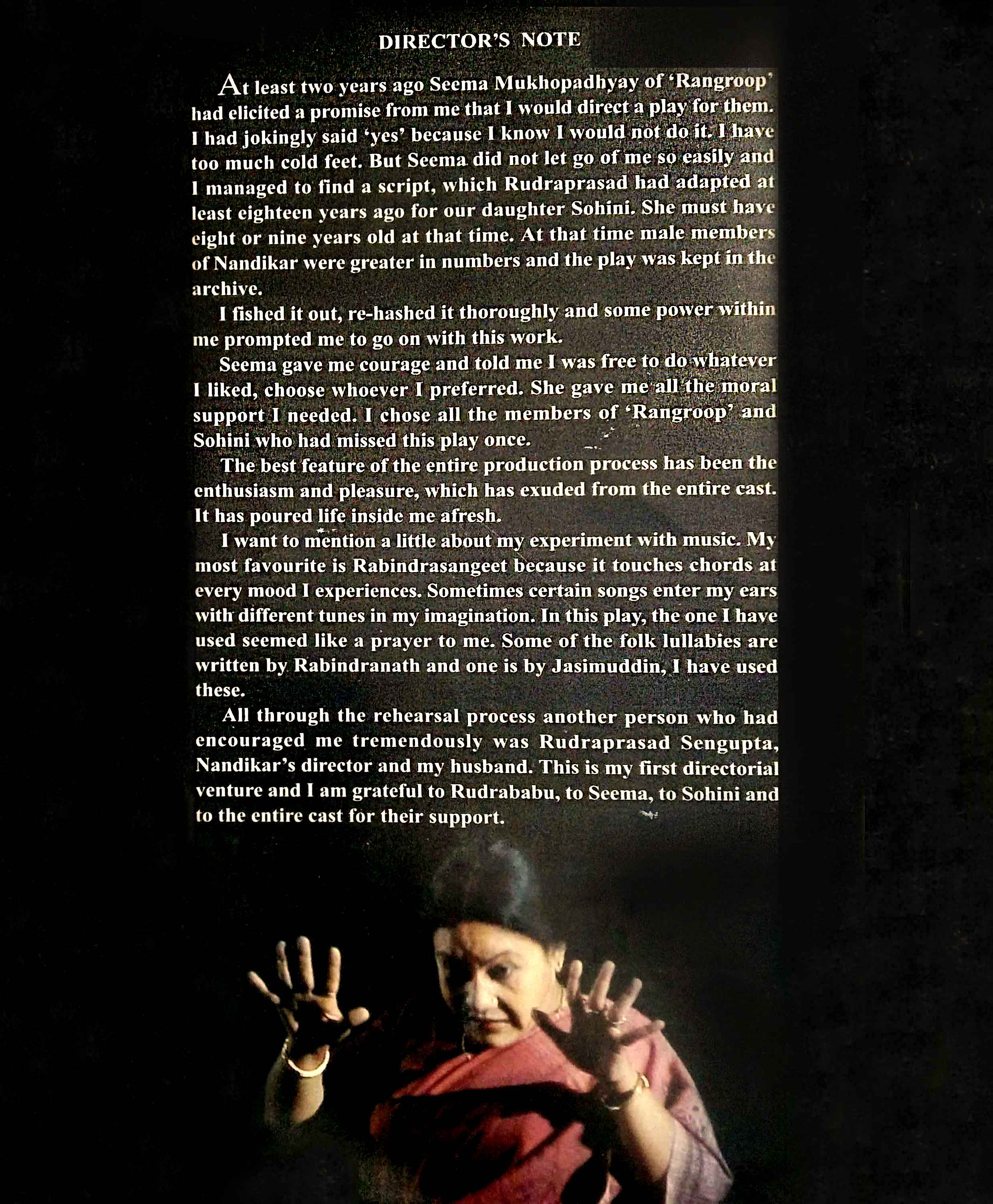 All through the rehearsals process another person who had encouraged me tremendously was Rudraprasad Sengupta, Nandikar's director and my husband. This is my first directorial venture and I am grateful to Rudra Babu, to Sima , to Sohini and to entire cast for their support.