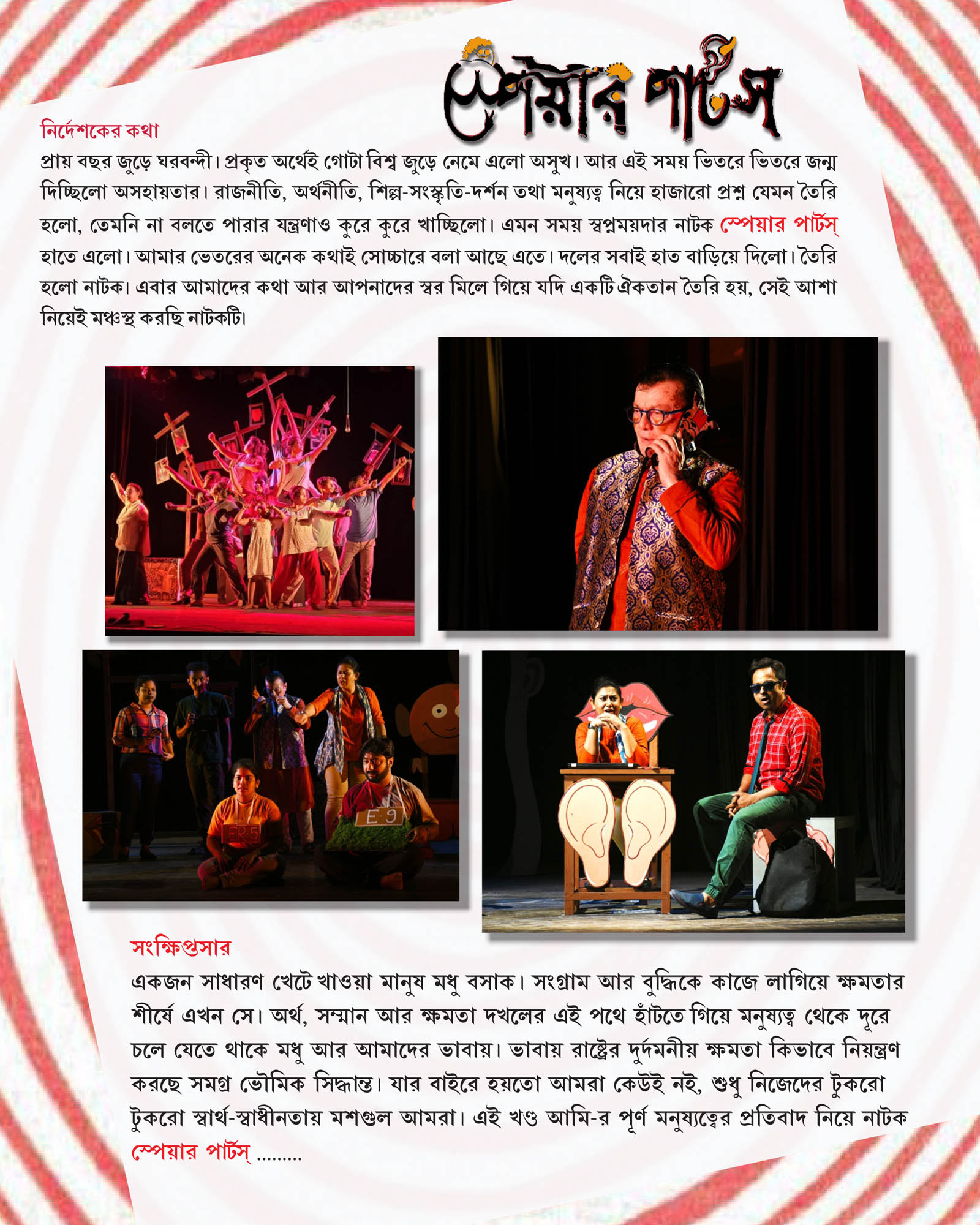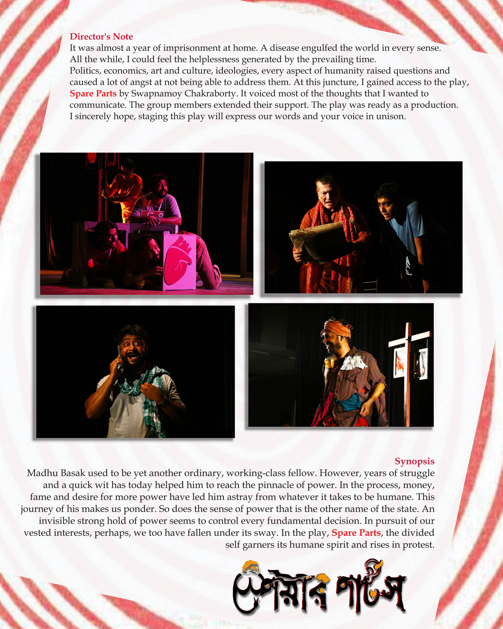 It was almost a year of imprisonment at home. A disease engulfed the world in every sense. All the while, I could feel the helplessness generated by the prevailing time. Politics, economics, art and culture, ideologies, every aspect of humanity raised questions and caused a lot of angst at not being able to address them. At this juncture, I gained access to the play, “Spare Parts” by Swapnamoy Chakraborty. It voiced most of the thoughts that I wanted to communicate. The group members extended their support. The play was ready as a production. I sincerely hope, staging this play will express our words and your voice in unison.