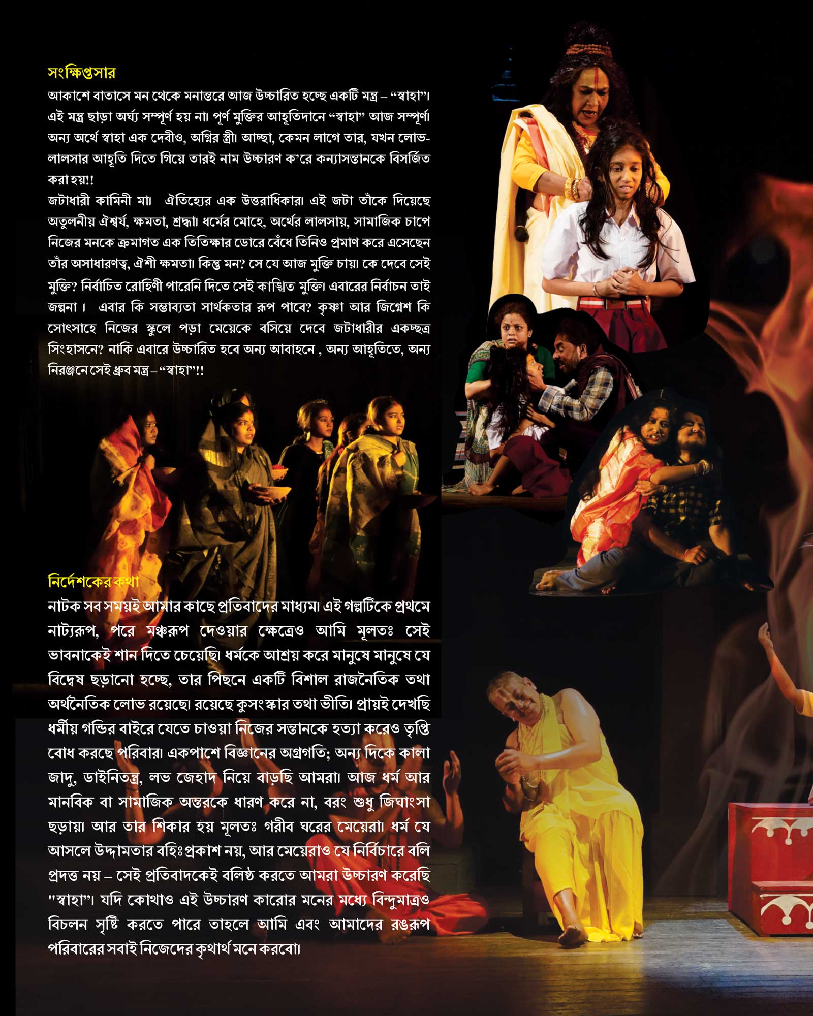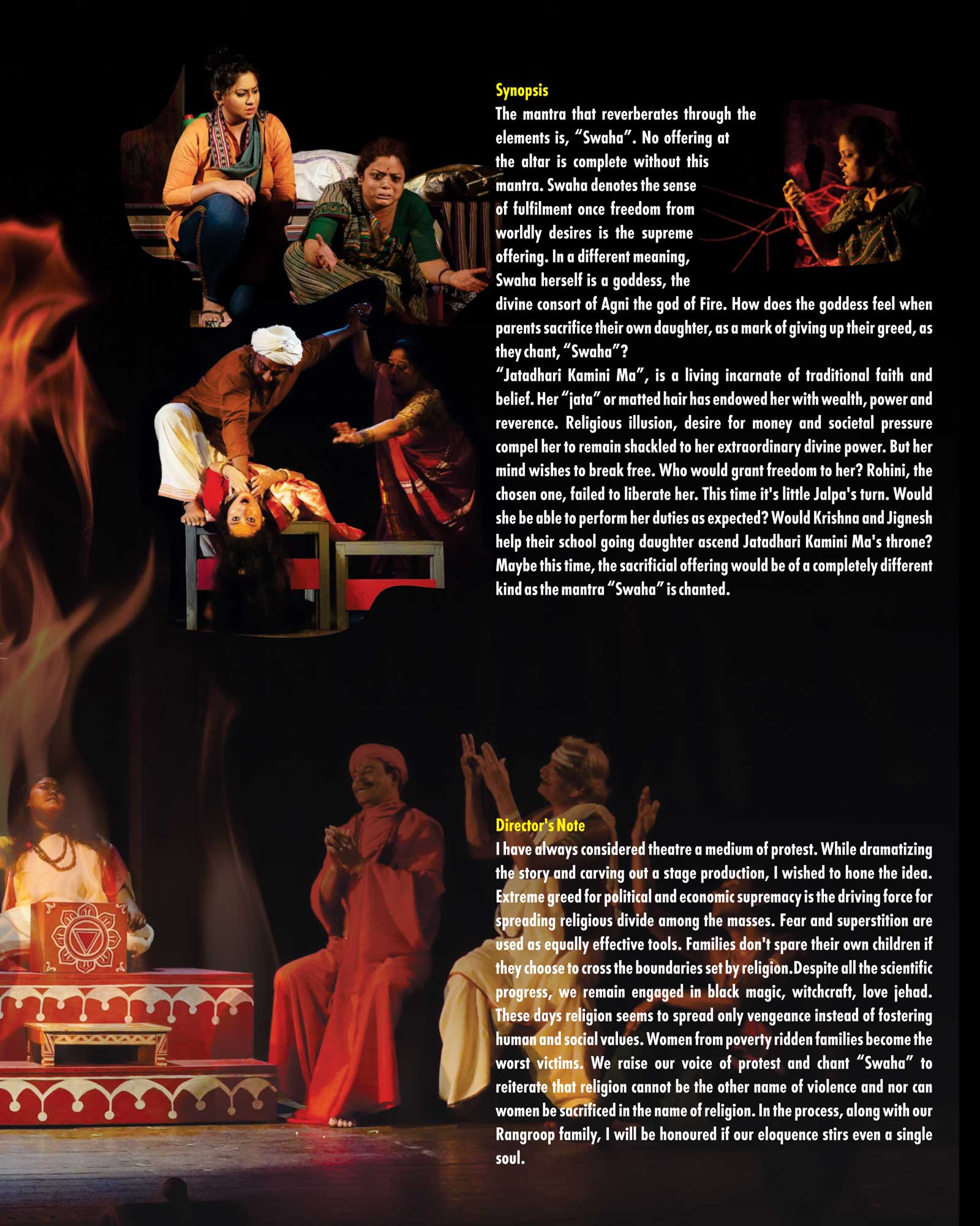 I have always considered theatre a medium of protest. While dramatizing the story and carving out a stage production. I wished to hone the idea. Extreme greed for political and economic supremacy is the driving force for spreading religion divide among the masses. Fear and superstition are used as equally effective tools. Families don't spare their own children if they choose to cross the boundaries set by religion. Despite all the scientific progress, we remain engaged in Black magic, witchcraft, love jehad. These days religion seems to spread only vengeance instead of fostering human and social values. Women from poverty ridden families become the worst victims. We raise our voice of protest and chant "Swaha" to reiterate that religion cannot be the other name of violence and nor can women be sacrificed in the name of religion. In the process, along with our Rangroop family, I will be honoured if our eloquence stirs even a single soul.