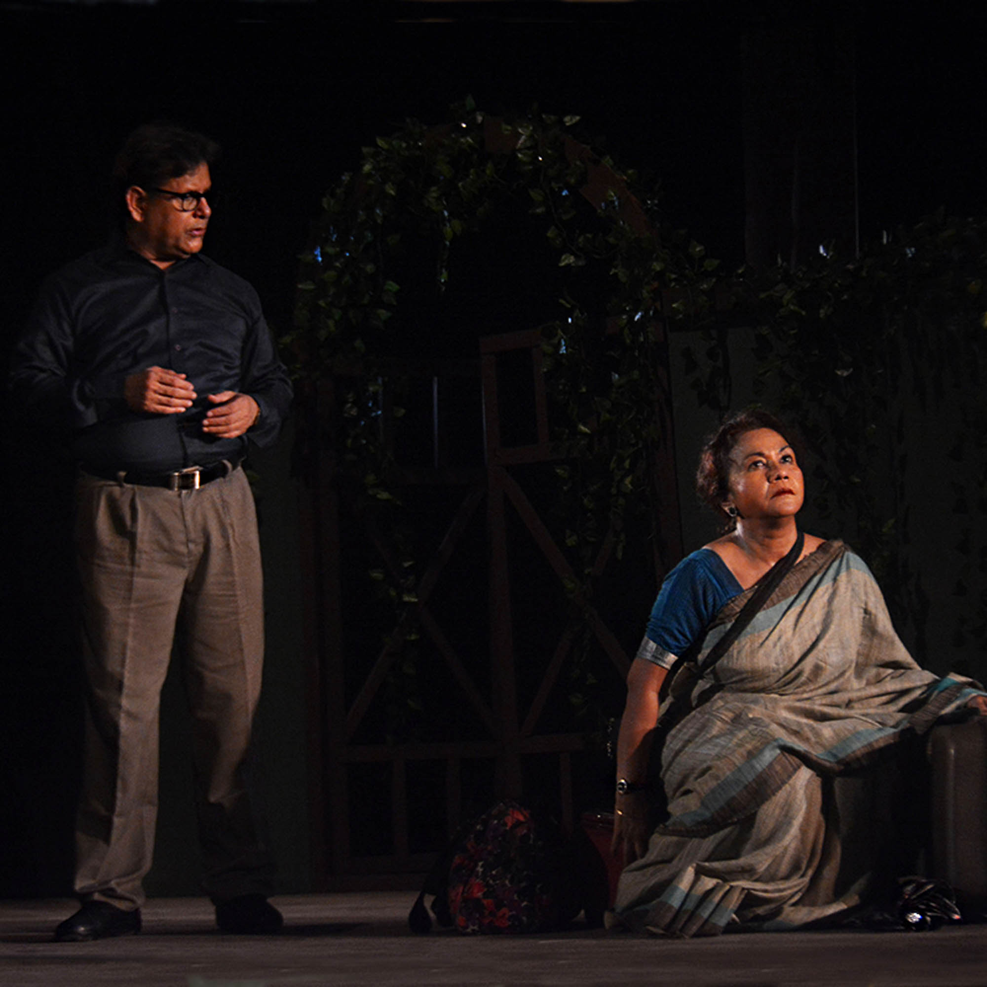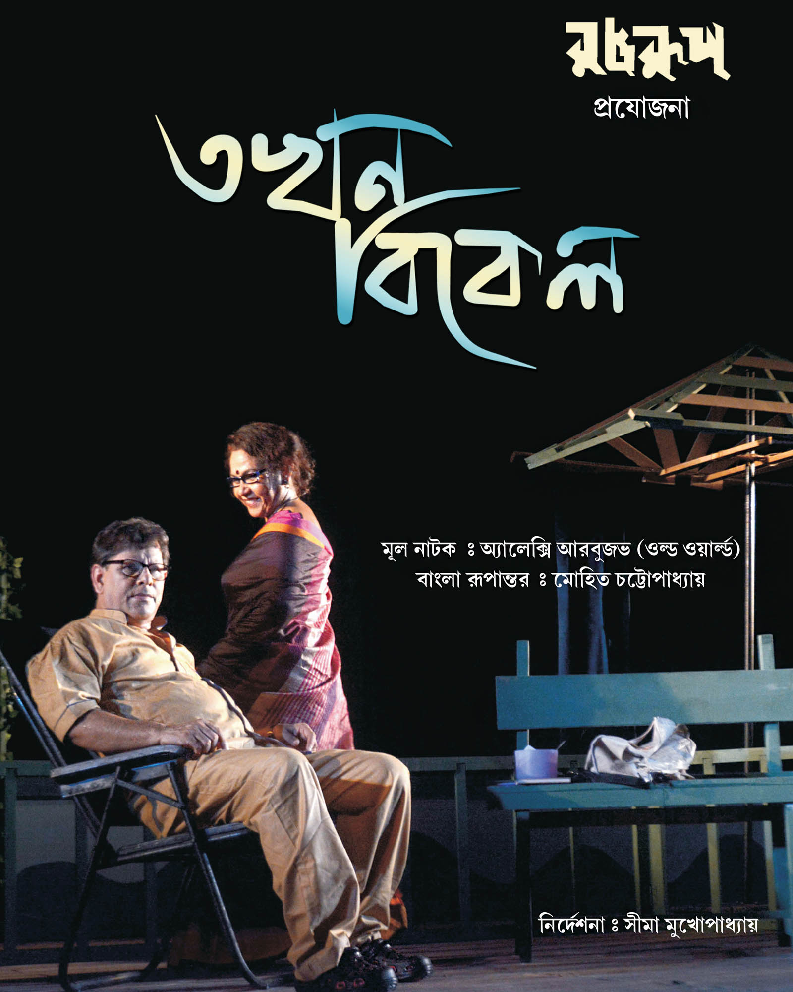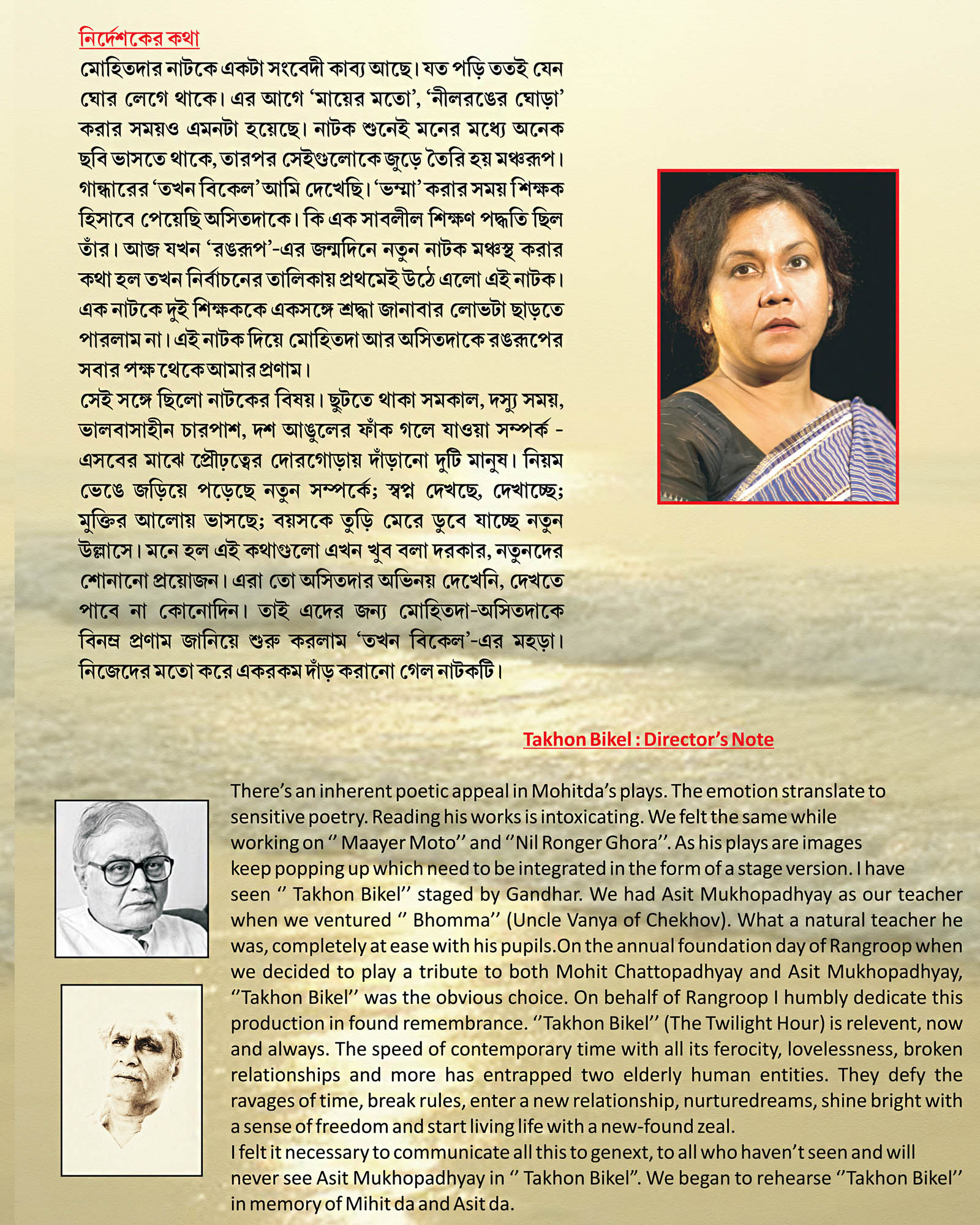 There's an inherent poetic appeal in Mohit-da's Plays. The emotion strangled to sensitive poetry. Reading his works is intoxicating. We felt the same while working on " Maayer Moto" and "Nil Ronger Ghora”. As his plays are images keep popping up which need to be integrated in the form of a stage version. I have seen "Takhon Bikel" staged by Gandhar. We had Asit Mukhopadhyay as our teacher when we ventured "Bhomma" (Uncle Vayna of Chekhov). What a natural teacher he was, completely at ease with his puplis. On the annual foundation day of Rangroop when we decided to play a tribute to both Mohit Chattopadhyay and Asit Mukhopadhyay, "Takhon Bikel" was the obvious choice. On behalf of Rangroop I humbly dedicate this production in found remembrance. "Takhon Bikel" (The Twilight Hour) is relevant, now and always. The speed of contemporary time with all its ferocity, lovelessness, broken relationships and more has entrapped two elderly human entities. They defy the ravages of time, break rules, enter a new relationship, nurture dreams, shine bright with a sense of freedom and start living life with a new-found zeal.