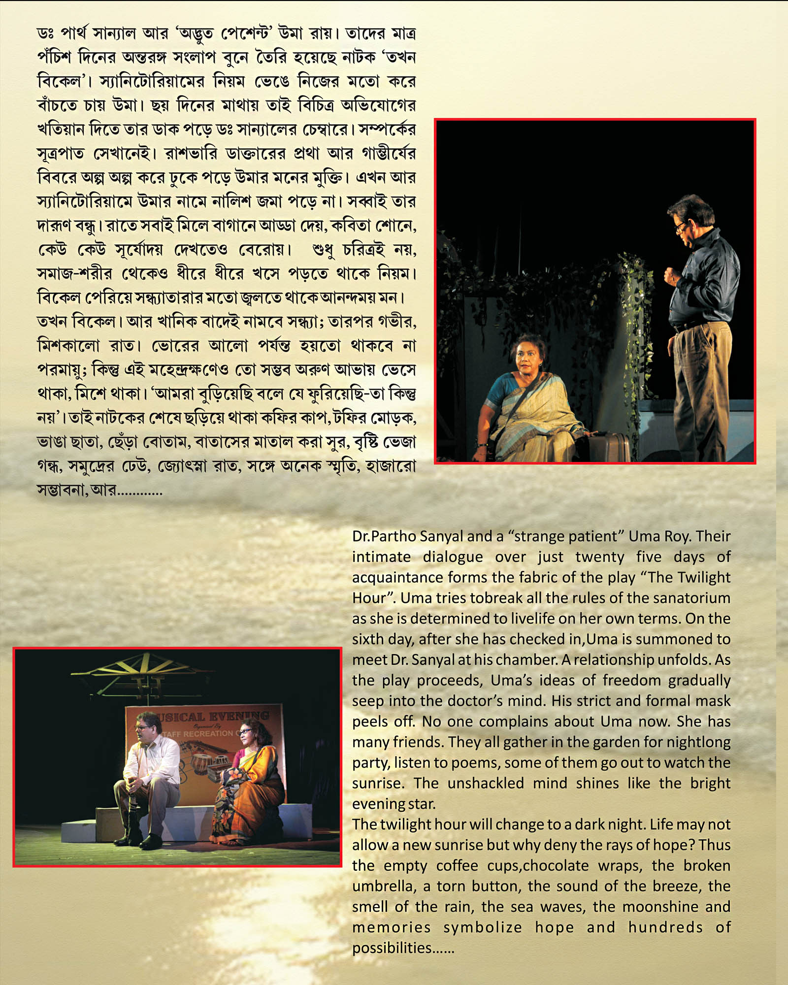 Dr. Partho Sanyal and a “strange patient” Uma Roy. Their intimate dialogue over just twenty five days of acquaintance forms the fabric of the play “The Twilight Hour”.